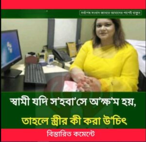নারীকেও এ-ক্ষেত্রে দায়িত্ব ভাগ করে নিতে হবে। এ-ক্ষেত্রে না’রীর যা যা করা উচিত করতে হবে। স্বামীর জন্য সা’জগো’জ করতে হবে। স্বামীকে আদর দিতে হবে। মিলনে তাকে উৎসাহী করে তুলতে হবে। আল্লাহর কাছে প্রার্থনা, তিনি যেন মু’সলমানদের অবস্থা ভালো করে দেন। আল্লাহই উত্তম জ্ঞানী।